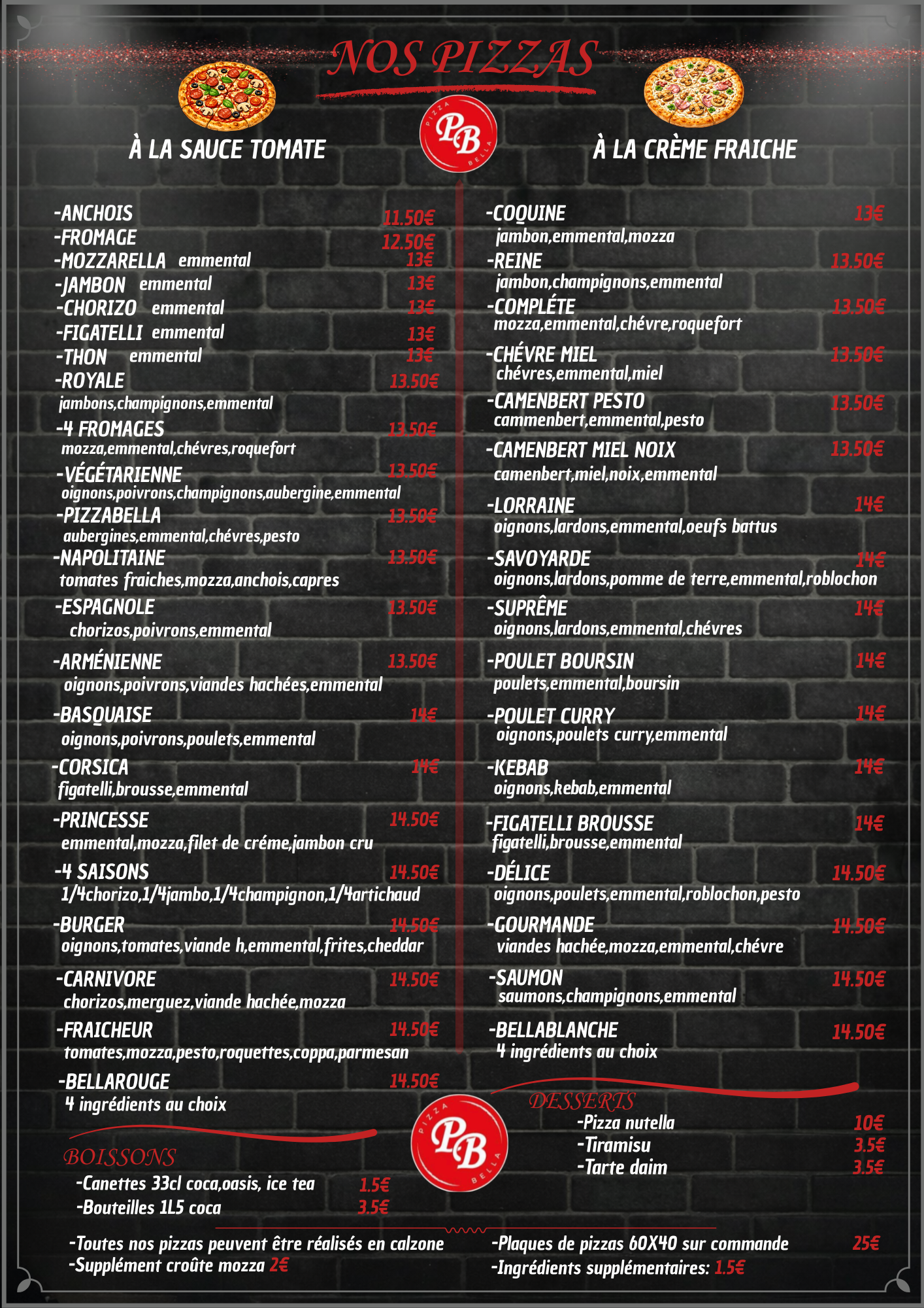 Pizzabella vous propose un large choix de pizzas en livraison ou à emporter, n'hésitez pas à passer commande au 0670310053, nous sommes ouvert du mardi au dimanche à partir de 18h. Livraison à partir de 15€